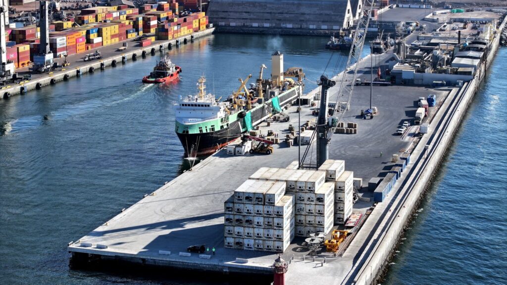 El puerto cuenta con aproximadamente 20 has. de aguas abrigadas esta formado por la ex Isla Serrano que forma la base de un molo de conexión a tierra firme y otro de abrigo de 846m de longitud en dirección 028°
